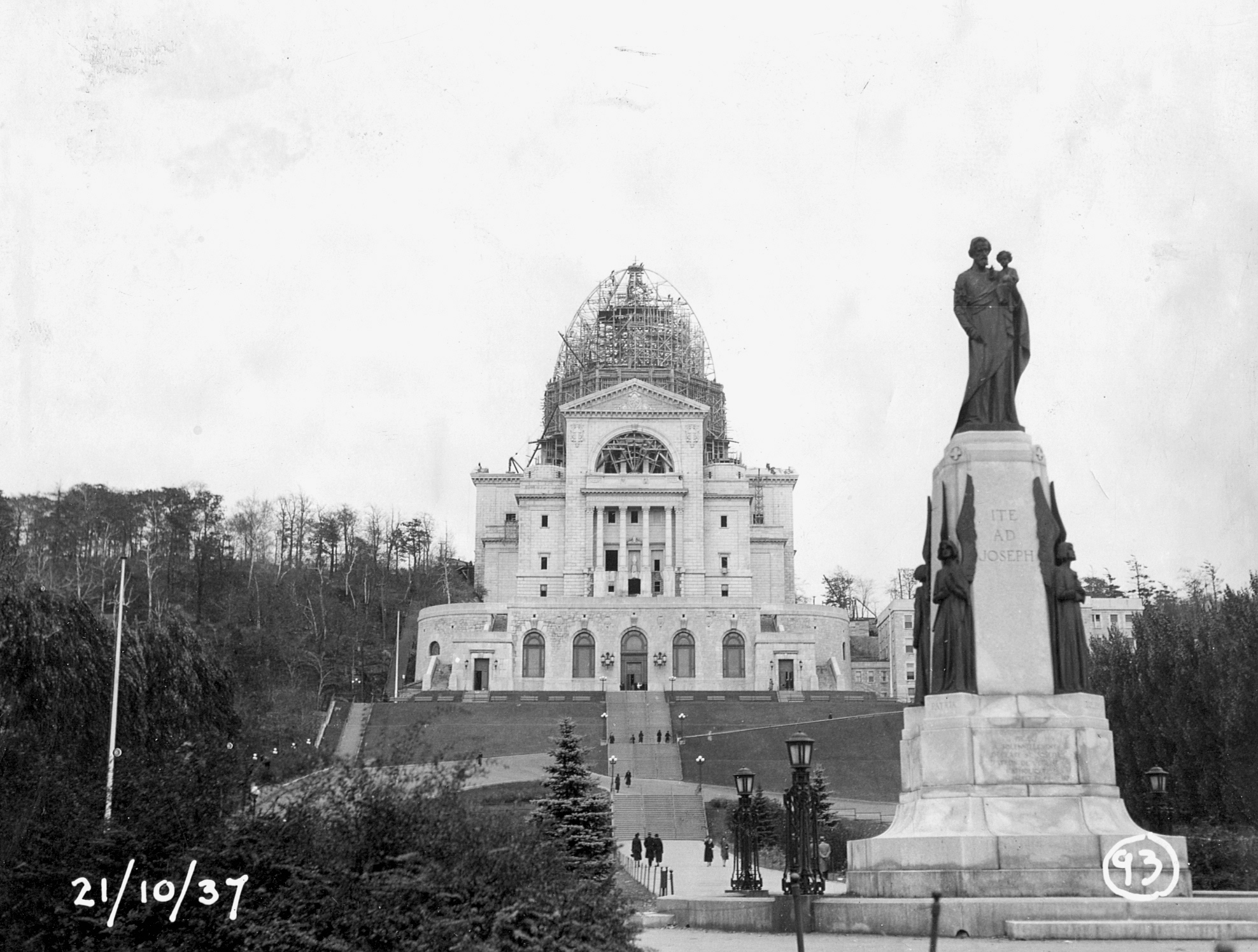 The dome in October 1937, a few months before the concrete was poured. The scaffolding for the upcoming concrete formwork can be seen. Photographer unknown. Archives of Saint Joseph’s Oratory of Mount Royal. 99-8a.