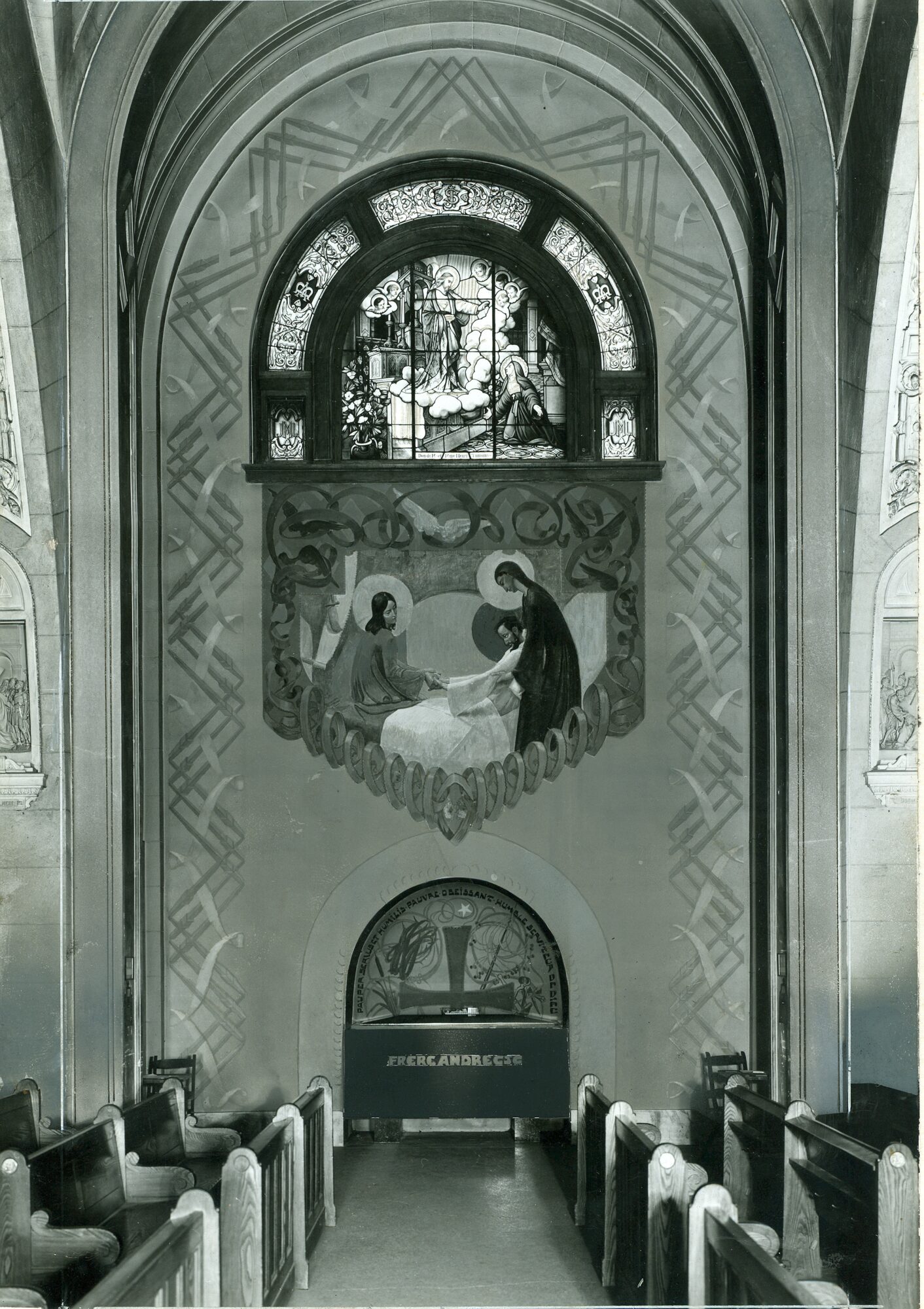 Fig. 1 : Brother André’s tomb and Charlier’s fresco, when the tomb was still in the Crypt. Archives of Saint Joseph’s Oratory of Mount Royal. 185-6.