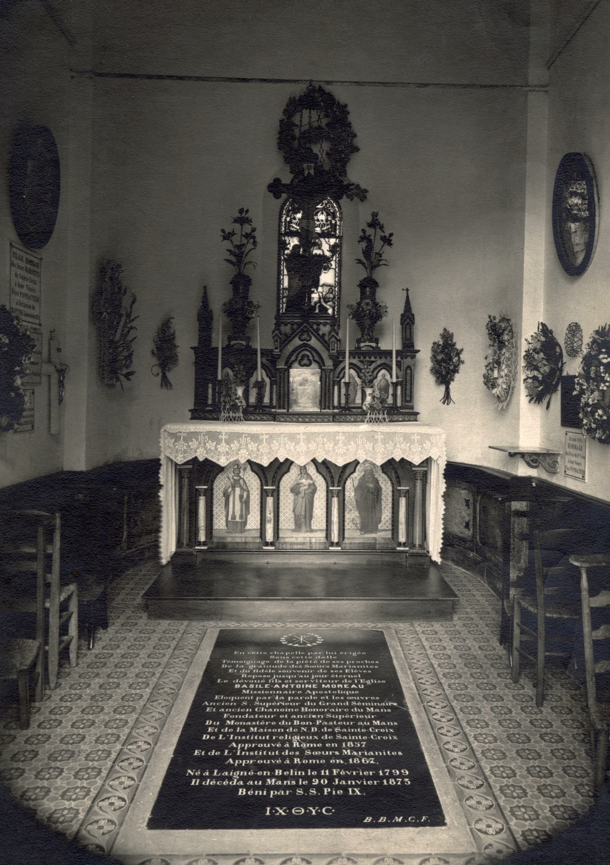 In the rear of the Basilica, in a small apsidal chapel, rests a remarkable and particularly precious object for the Congregation of Holy Cross: the original tombstone of its founder, Blessed Basile-Antoine-Marie Moreau. The story of its journey is relatively enigmatic.