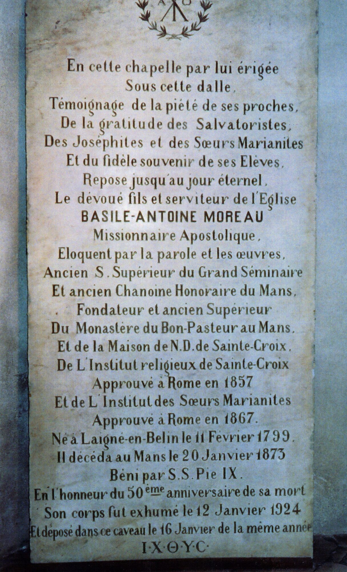 The first tombstone of Father Basile Moreau, in dark slate, in the cemetery chapel of the Congregation of Holy Cross in Le Mans, France. Archives Service of the Canadian Province of the Congregation of Holy Cross, A1,21,6.1
