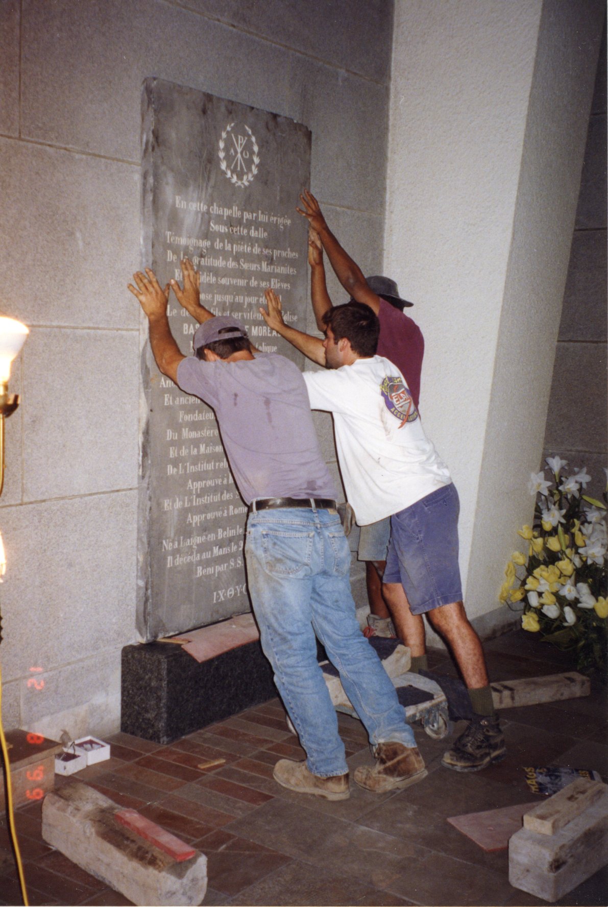 With the removal of the old black slate tombstone, the question arose of where to store it. As an authentic relic, it was too precious not to be preserved. Possibly foreseeing another major war in Europe, it was sent to Canada between 1924 and 1939. A great mystery remains regarding the conditions under which it was transported to Canada. In 1945, Father André Legault wrote in his book “Father Moreau, 1799-1873: Founder of the Religious and Nuns of Holy Cross”: “This tombstone […] was brought from France to America, as a notable relic.” We do not know where it was at that time, but towards the end of 1960, the provincial authorities of the congregation decided to move it. The tombstone was then attached to a wall near the funeral chapel of the congregation cemetery, behind the church of Saint-Laurent. As it increasingly struggled with the Canadian climate, it was decided to install it in the main chapel of Saint-Laurent College, near the jubé door of the organ. After the sale of the college in 1967, it was transferred to the basement of the church of Saint-Laurent.