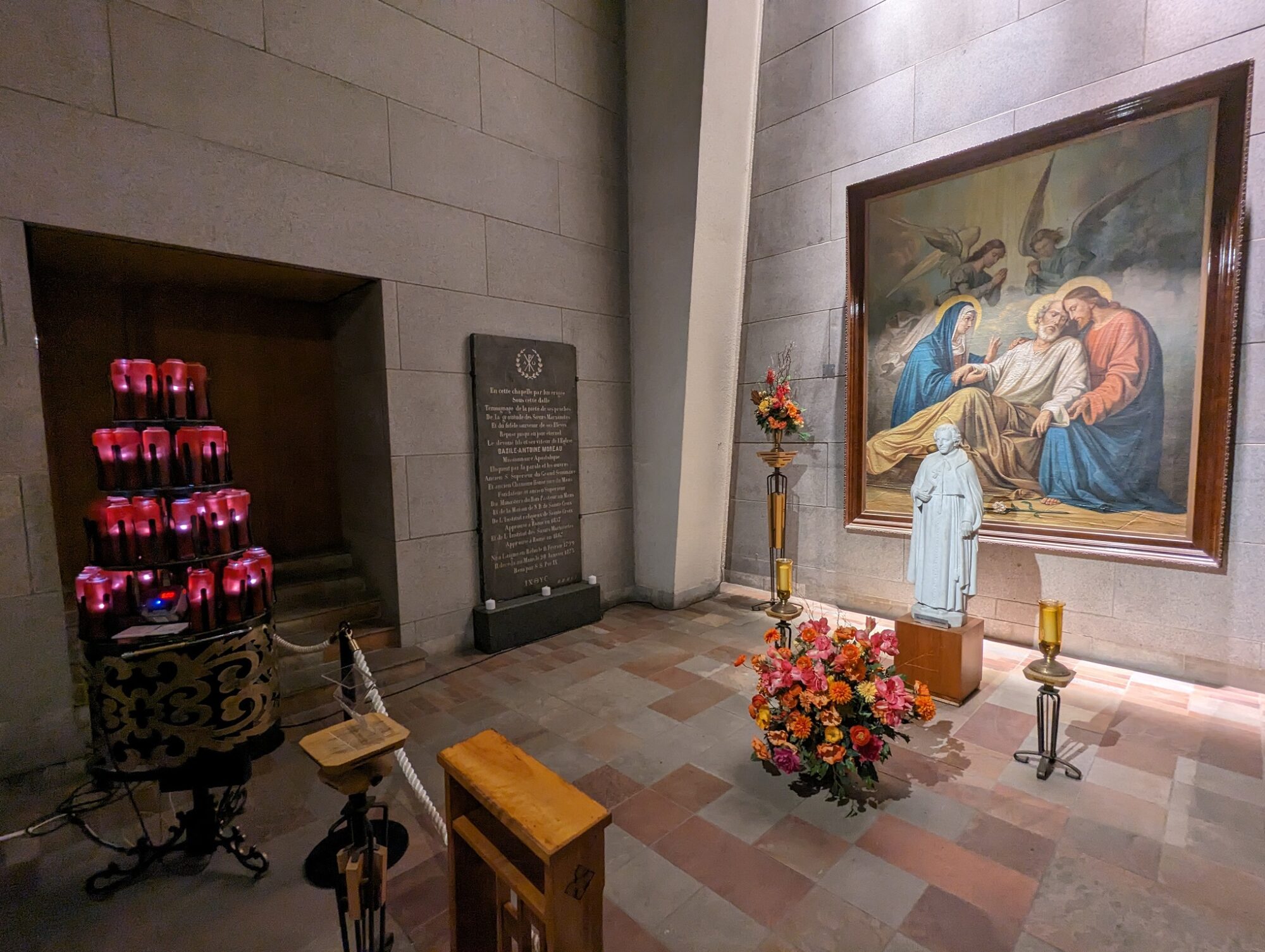 After the beatification of Father Moreau in 2007, the authorities of the Oratory could finally transform the apsidal chapel into a chapel dedicated to the founding father. For the occasion, a bust of Father Moreau was added. However, the tombstone remained hidden from the public by a wall, and for security reasons, the chapel was closed off by a grille, leaving only the bust visible. It was only during the exhibition commemorating the 150th anniversary of Father Moreau’s death on January 20, 2023, that the grilles were finally opened, allowing the faithful to pray inside the chapel and admire this precious relic. Additionally, a white stone statue of the Blessed, coming from the Sisters of Holy Cross, sits in the center of this chapel. The wonderful irony of history is that he who had dreamed of a shrine dedicated to Saint Joseph, now has his tombstone resting in the largest shrine dedicated to the foster father of the Savior, built by the humblest of his spiritual sons who preceded him in holiness, Saint Brother André.