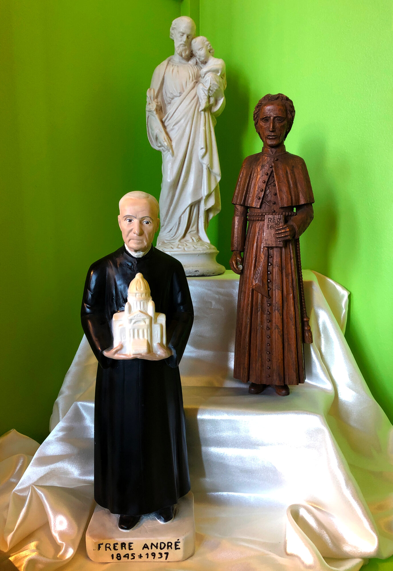 Statuettes représentant saint frère André, le père Basile-Antoine Moreau et saint Joseph. La statuette en bois du père Moreau a été réalisée en 1933 par le frère Abundius Piché, c.s.c., un ami du frère André. Musée de l’Oratoire Saint-Joseph du Mont-Royal, 1979-64-S; 1989.155.