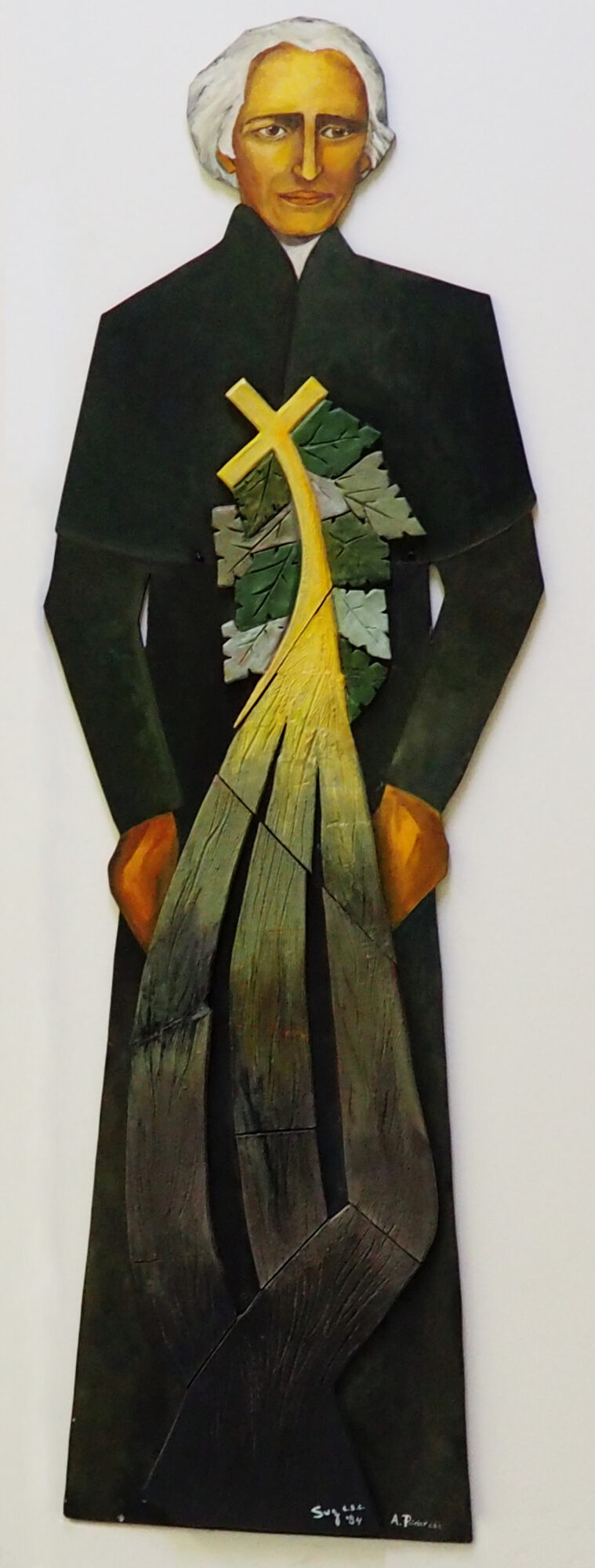 Père Basile Moreau et l’arbre de Sainte-Croix, œuvre en bois et céramique réalisée par Sœur Suzanne Baron, c.s.c. (S. M. des Oliviers) et Sœur Adrienne Poirier, c.s.c. (S. M. Bernard, Abbé), 1984. Musée communautaire des Sœurs de Sainte-Croix, 2020.27.