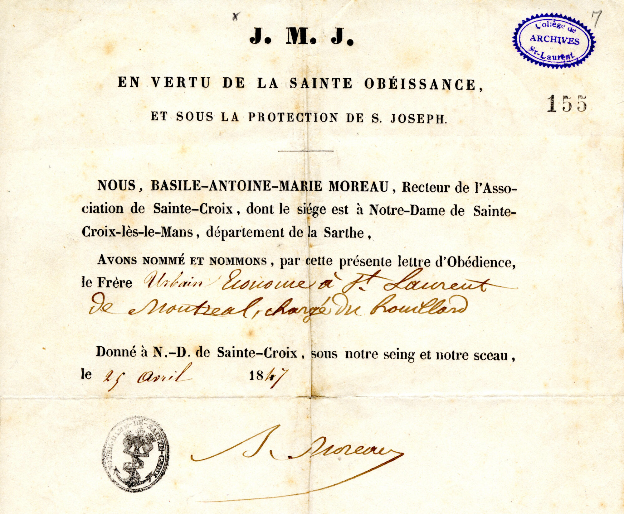 Lettre de nomination du frère Urbain à Saint-Laurent écrite par le père Basile-Antoine Moreau sous la protection de saint Joseph, 25 avril 1847. Service d’archives de la Province canadienne de la congrégation de Sainte-Croix, A1,1.2.
