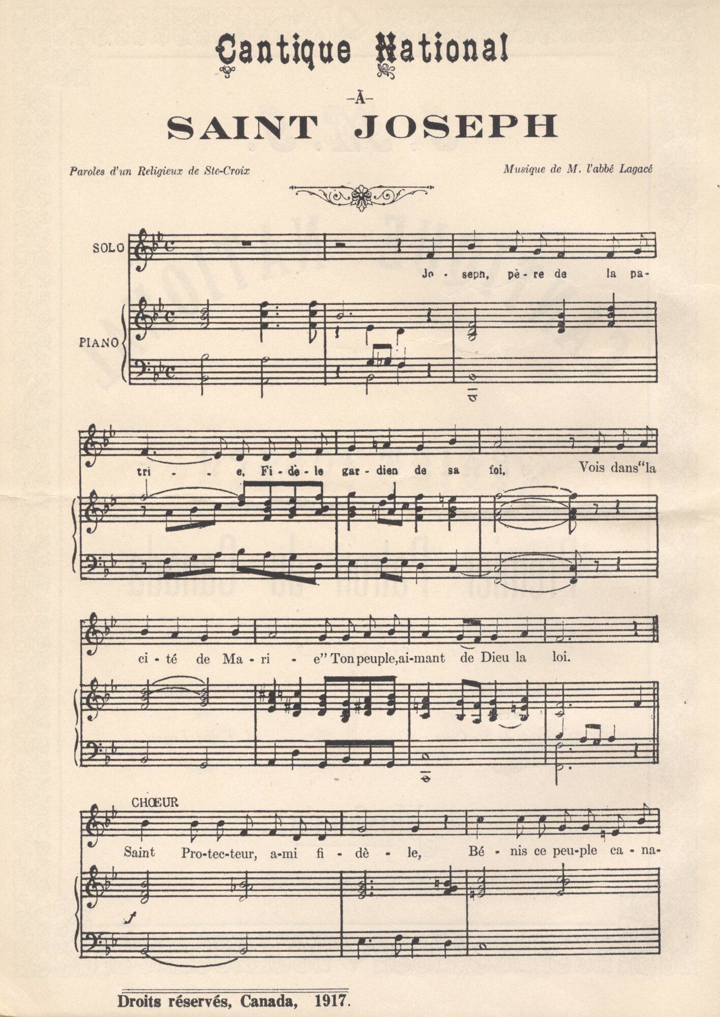 « Cantique national à Saint-Joseph. Premier Patron du Canada ». Paroles d’un religieux de Sainte-Croix et musique de M. l’abbé Lagacé, Montréal, 1917. Centre d’archives et de documentation Roland-Gauthier, Jpe L24c.